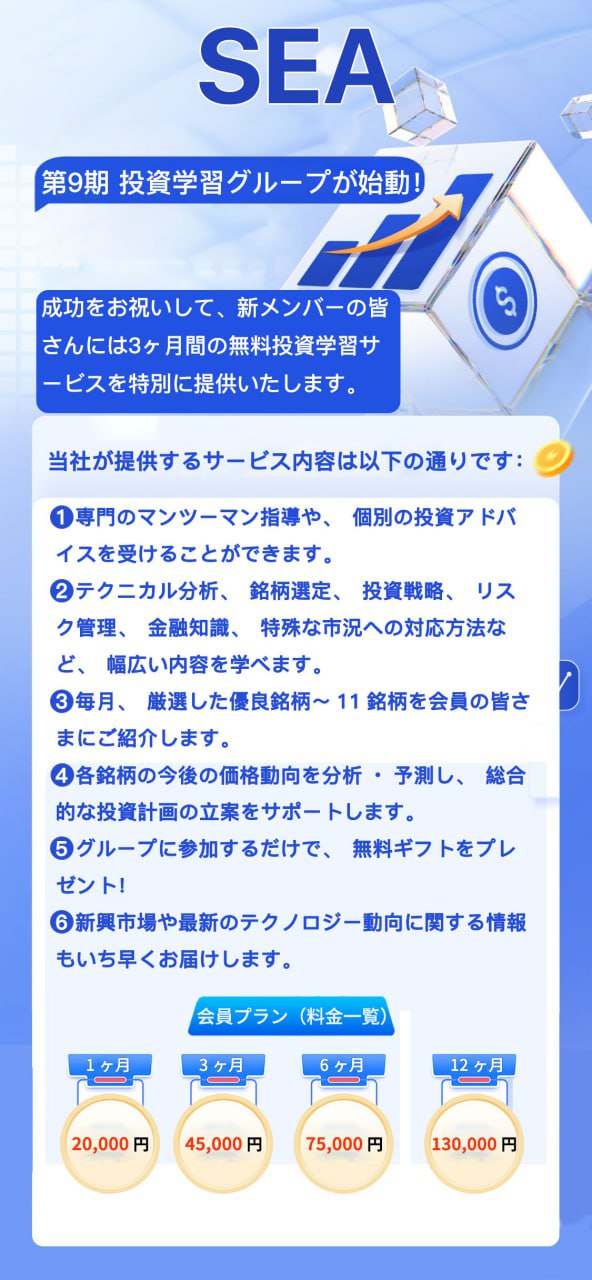 さらに、各銘柄の動向や市場サイクルを踏まえた分析・予測を通じて、個々の状況に合った投資計画の立案をサポートします。専用グループでは日々の市況解説、チャート分析、リアルタイムのQ&Aや実践講評が行われ、初心者から経験者まで継続的に学びを深められる体制が整っています。市場環境やグローバル動向に関する最新情報もいち早く共有され、参加者が大局観を養いながら安定した判断を下せるよう支援いたします。